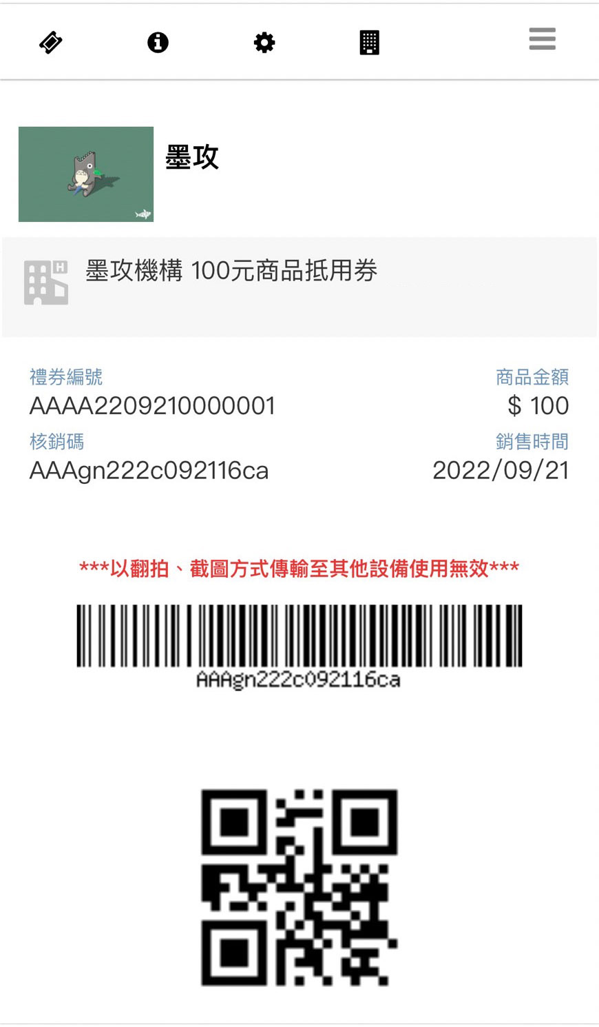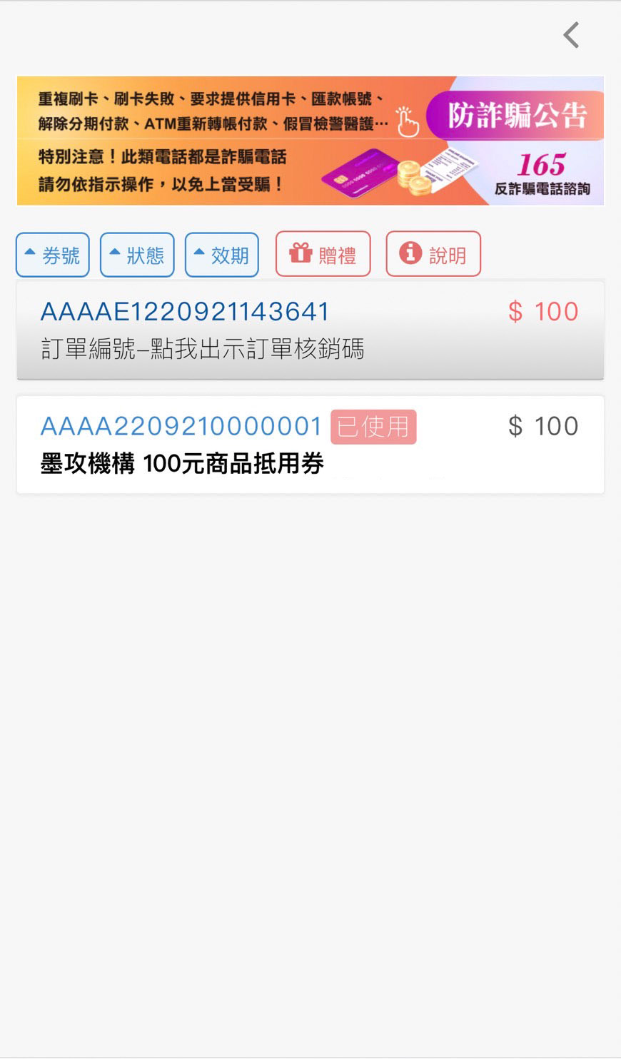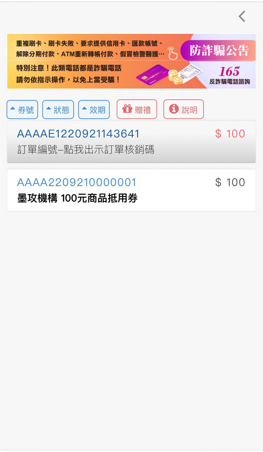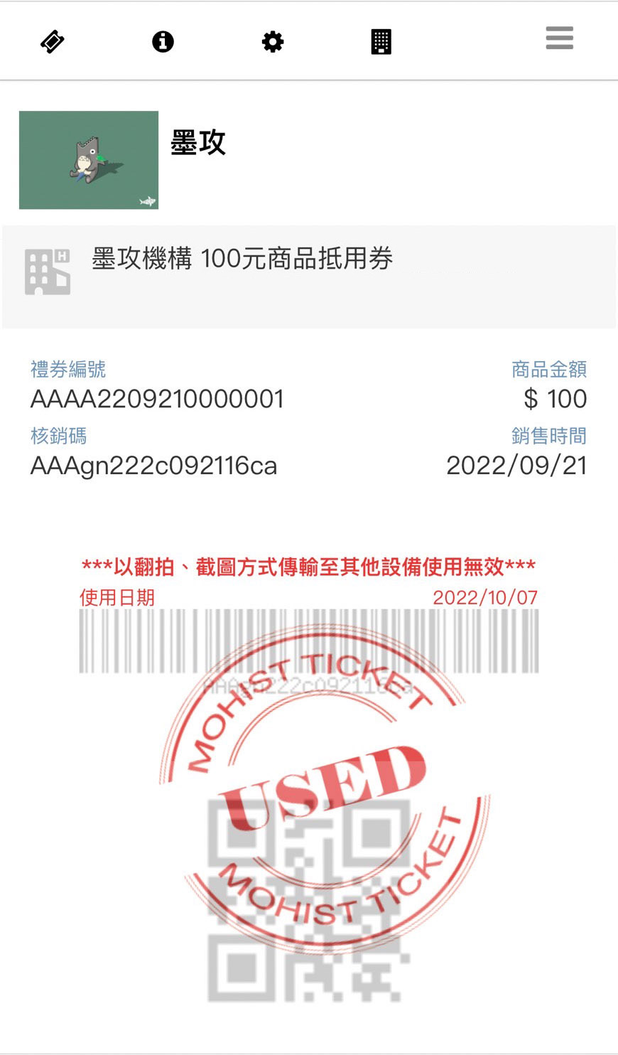 8. 完成轉贈之電子票券則會出現以下畫面