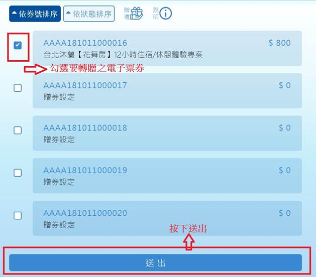 5. 勾選要轉贈之電子票券後按下送出