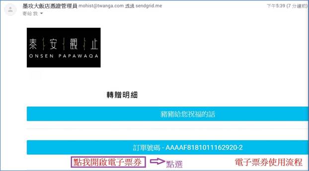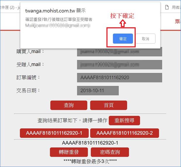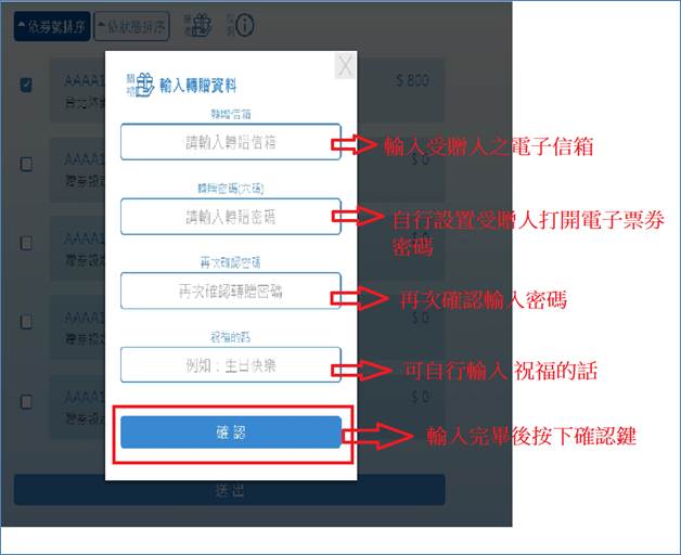 1. 按下轉贈重發後按下確認鍵受贈者即收到轉贈電子票券之信件