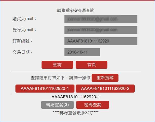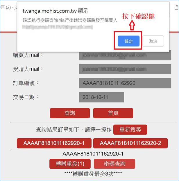 1. 按下密碼查詢後按下確認鍵轉贈者即收到轉贈密碼查詢之信件