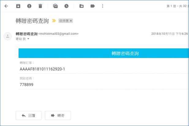 ※轉贈者收到轉贈密碼查詢之信件